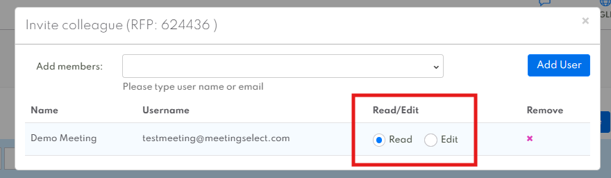 After clicking on “Add User”, you can specify which rights your colleague may have. You can grant “Read” rights, which will allow your colleague to view the request/booking, but not edit it. If you grant your colleague “Edit” rights, they will be able to view and edit the request/booking.