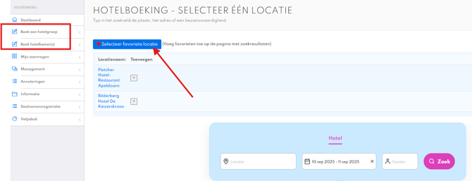 Tevens kun je vanuit het hoofdmenu bij “ Boek een hotelgroep” of “ Boek een hotelkamers(s)” ook klikken op “ Selecteer favoriete locaties en dan vouwt de lijst met jouw favoriete locaties uit. Vanuit hier voeg je eenvoudig de locaties toe aan jouw aanvraag.