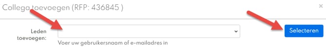 Vul het e-mailadres in van de collega die je wilt toevoegen aan de aanvraag/boeking en klik op Selecteren.