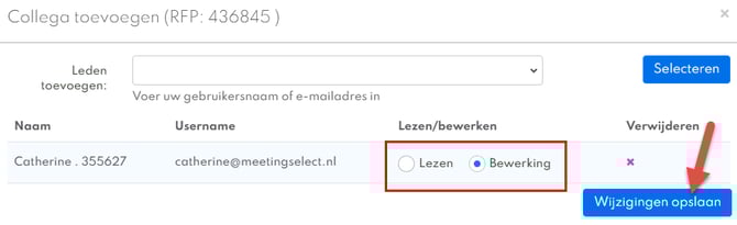 Nadat je op selecteren hebt geklikt kan je aangeven welke rechten je collega mag hebben. Je kunt de rechten Lezen geven, met deze rechten kan je collega de aanvraag/boeking inzien, maar niet de aanvraag/boeking bewerken. Indien je jouw collega de rechten Bewerking geeft, dan kan je collega de aanvraag/boeking inzien en tevens ook bewerken.