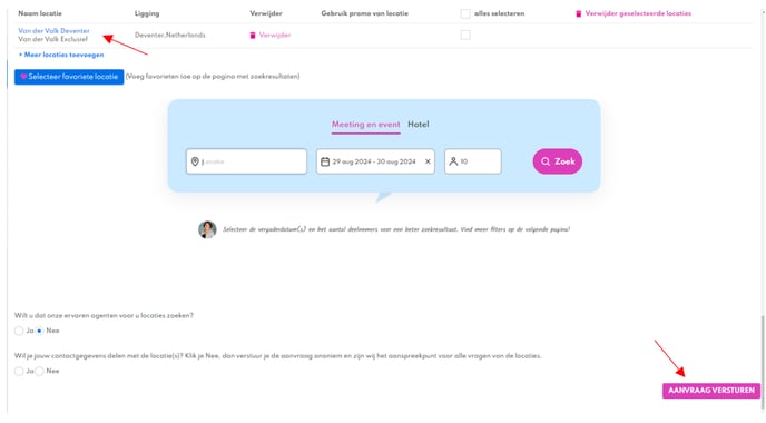 De locatie zal dan direct aan uw boeking toegevoegd worden. Voor het afronden van de boeking klikt u dan op “Aanvraag versturen”.