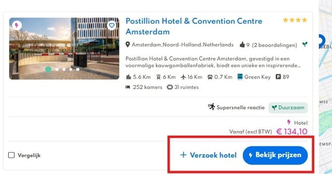 Op de pagina met de zoekresultaten kan je alle beschikbare hotels en tarieven zien. Voor het boeken van de overnachtingslocatie klik je op “+ Verzoek hotel”