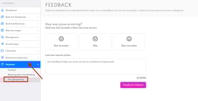 In het hoofdmenu onder Helpdesk zie je de optie Terugkoppeling.