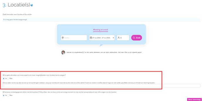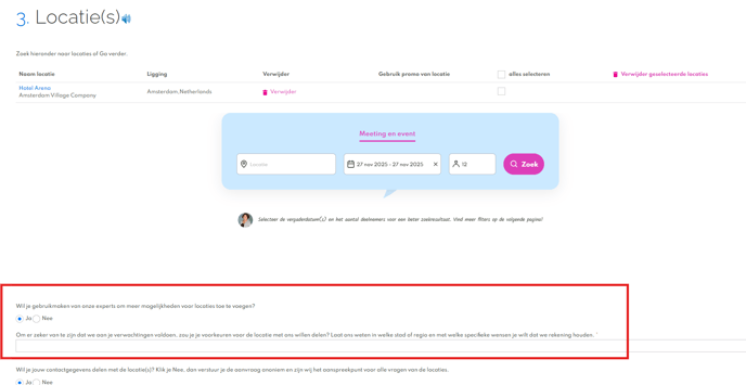 - Je selecteert zelf (een) locatie(s) en wilt dat Meetingselect hier nog locaties aan toevoegt. Bij de vraag ‘Wilt u dat onze ervaren agenten voor u locaties zoeken?’ vul dan Ja in. De aanvraag wordt dan behandeld als een advies aanvraag Meetingselect zal dan voor jou locaties toevoegen aan jouw aanvraag.