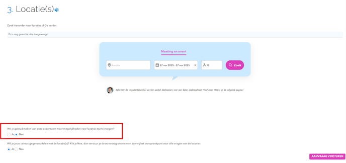 Meetingselect stuurt standaard de aanvraag anoniem uit naar de locatie. Indien je jouw contactgegevens wenst te delen met de locatie, kies dan voor de optie “Ja” om jouw contactgegevens te delen met de locatie.
